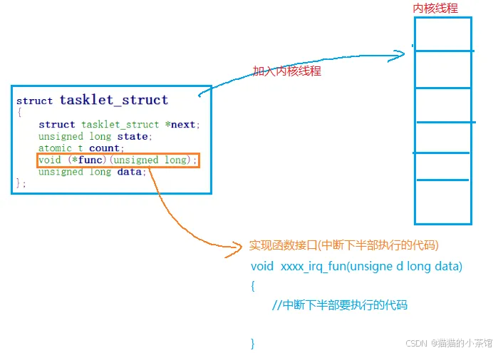 void tasklet_init(struct tasklet_struct *t,void (*func)(unsigned long),