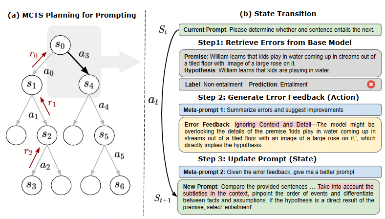 然后,MCTS 用于探索提示空间,平衡"探索"和"利用",以找到错误反馈的高奖励路径,从而产生可推广的专家级提示