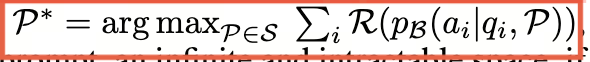 Prompt 优化的目标是找到最优的自然语言 prompt P*,使得奖励函数 R 的结果(例如准确率、F1 等)最大
