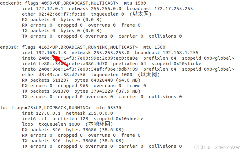 3、使用ifconfig命令可查看ubuntu的ip地址