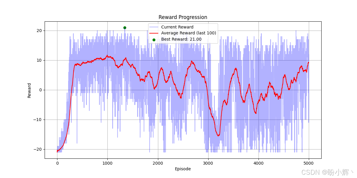 训练过程中,回合中的奖励的运行平均值(红色曲线)从 -20 开始,这意味着智能体在一局游戏中得分为 0,而对手得了 20 分。随着回合的进行,平均奖励不断增加,到第 200 回合时,平均奖励越过了零值。这意味着在经过 200 回合的训练后,智能体已达到与对手势均力敌的水平。此后平均奖励转为正值,表明智能体开始占据上风。训练到第 1000 回合时,智能体平均每局已能领先对手 7 分以上。我们可以训练更长时间,观察智能体是否能实现完全压制。我们已经完成了对 DQN 模型的深入探讨。在本节中,我们实现了 DQN 模型,但本节介绍的思想方法同样适用于其他Q学习变体及深度强化学习算法。