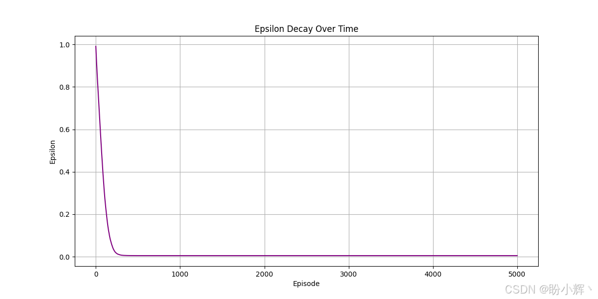 下图显示了在训练过程中 epsilon 值随回合的减少情况:
