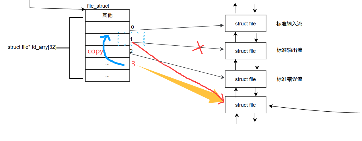 struct file结构体的首地址,填入当前进程fd_array数组中下标为3的位置(因0、1、2被标准输入/输出/错误占用),使fd_array[3]指针精准指向该文件的struct file结构体; - 最后将下标值3作为文件描述符返回给调用进程,进程后续通过这个描述符就能找到对应的