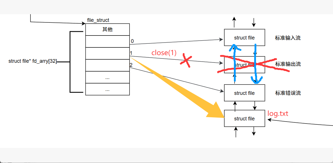 如上述图片,我们让本应该输出到"显示器文件"的数据输出到log.txt文件当中,那么我们可以在打开log.txt文件之前将文件描述符为1的文件关闭。