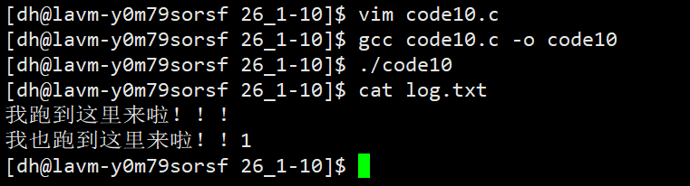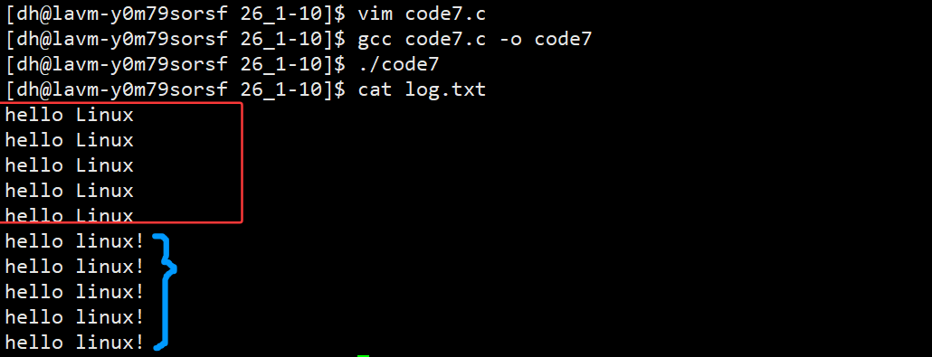 但我们若是将程序运行结果重定向输出到文件log.txt当中,我们会发现log.txt文件当中只有向标准输出流输出的两行字符串,而向标准错误流输出的两行数据并没有重定向到文件当中,而是仍然输出到了显示器上。