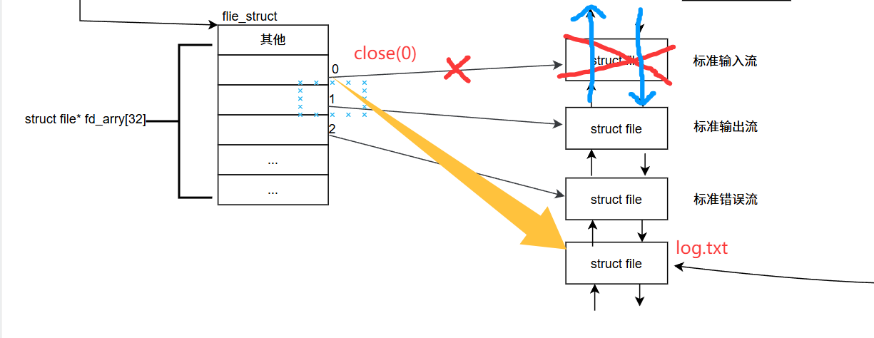 我们可以在打开log.txt文件之前将文件描述符为0的文件关闭,这样一来,当我们后续打开log.txt文件时所分配到的文件描述符就是0。