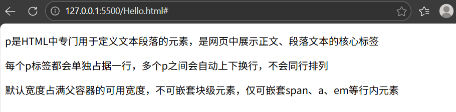 <p>每个p标签都会单独占据一行,多个p之间会自动上下换行,不会同行排列</p>