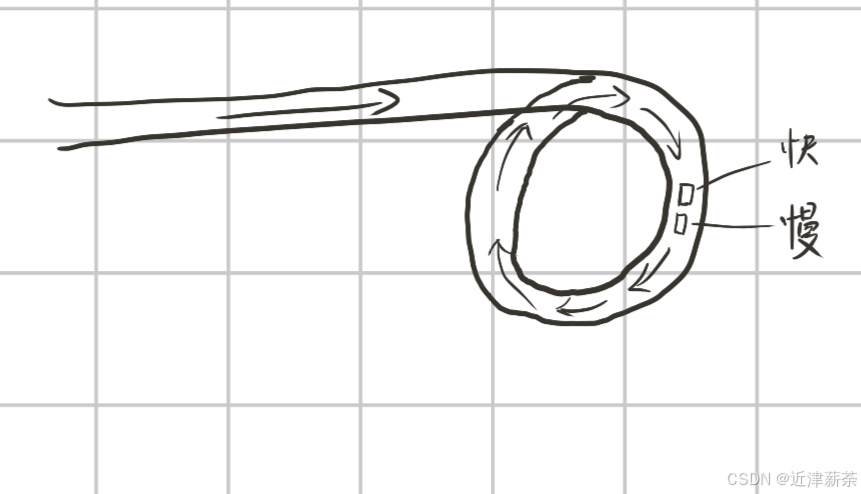 就比如一个线性跑道(单向通行的一条路),一辆快车和一辆慢车在上边行驶,如果跑道带环,进入环之后,快车和慢车就一定会相遇(套圈)。