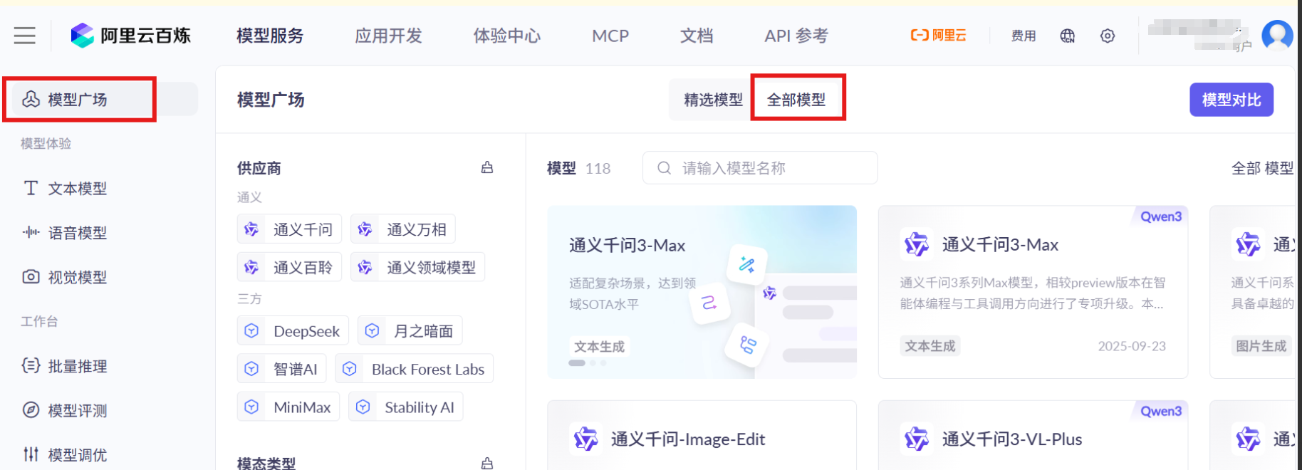 点击模型广场,右侧全部模型 tab,可以查看并浏览全部模型