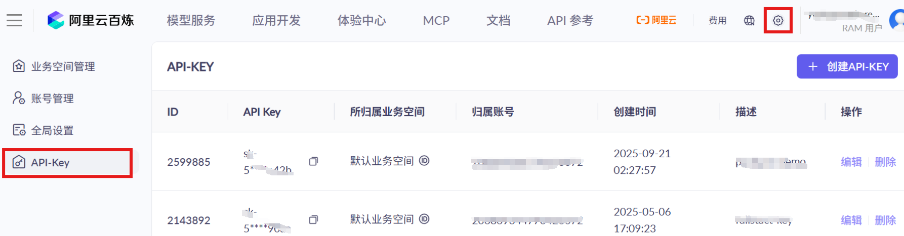 再点击右上角 创建 API-KEY 按钮,创建 api key