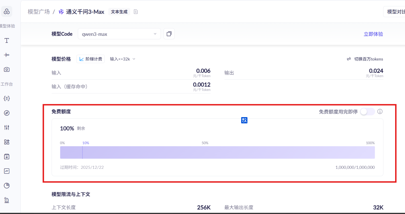 在页面的中间部分,可以看到模型的免费额度相关信息。