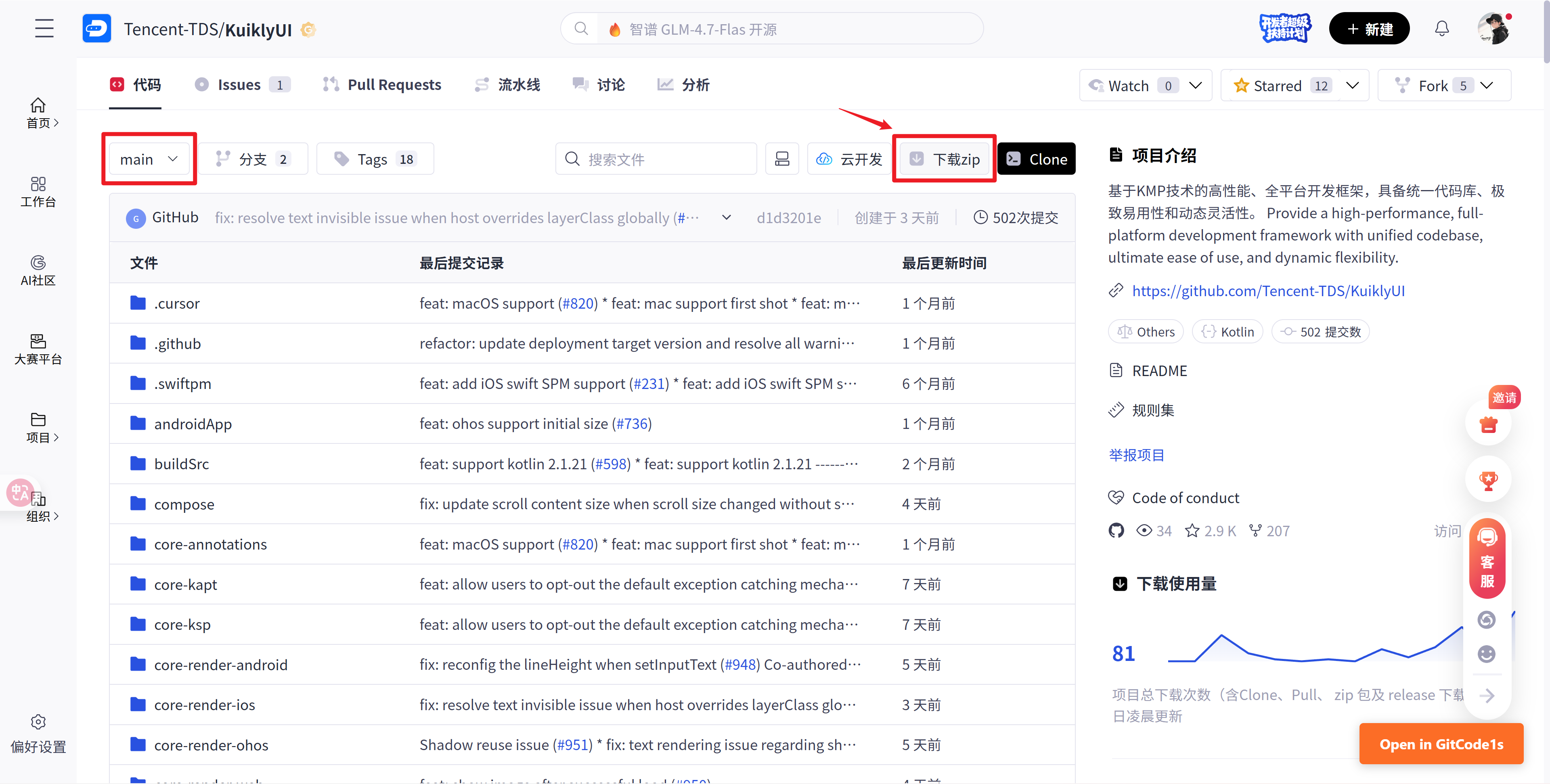 KuiklyUI的模板代码放在了AotmGit平台上,我们需要把这个代码拉取下来,考虑到初学者可能不会使用Git,本文会尽可能避免使用Git
