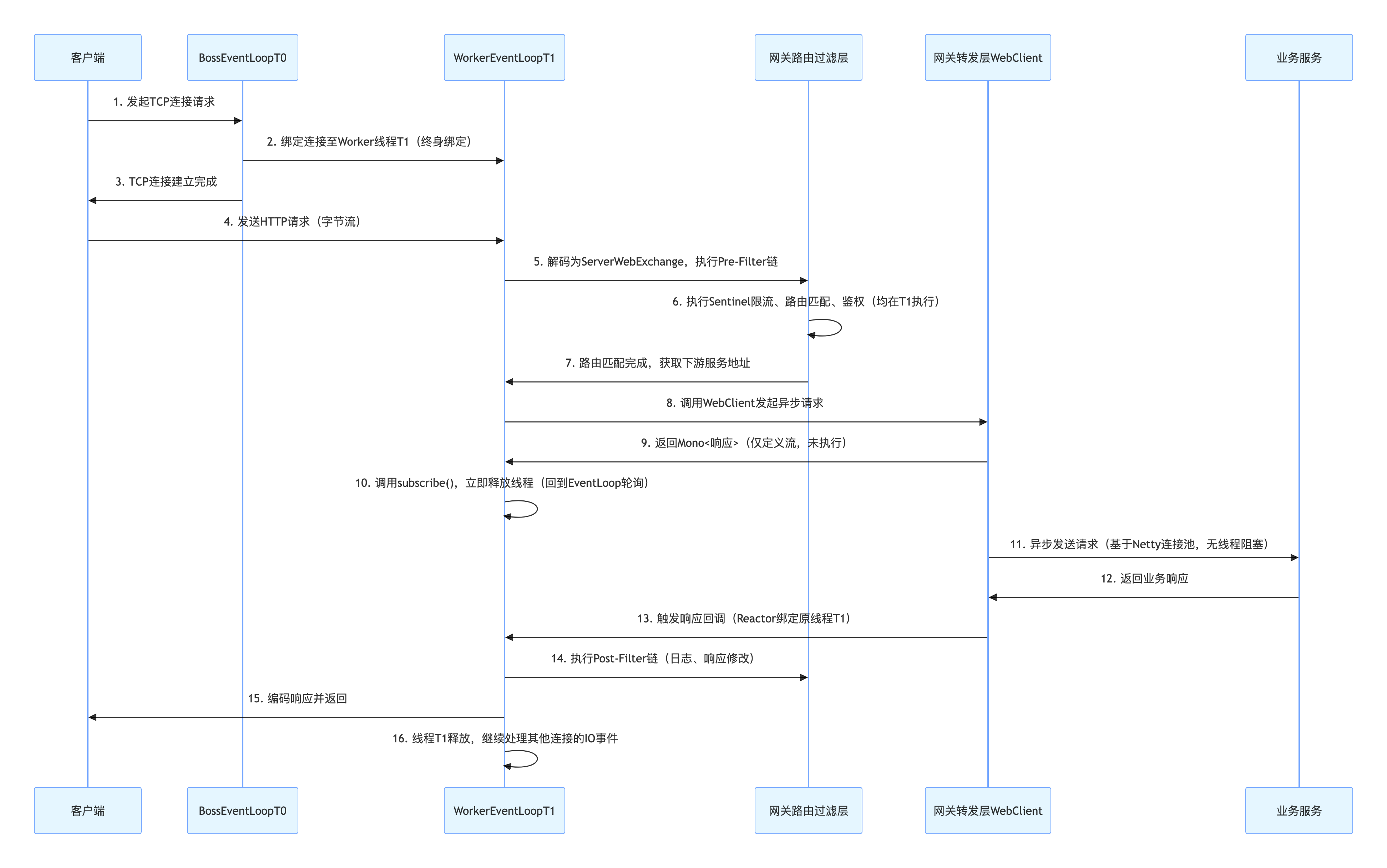 - 请求转发(转发层):WebClient 向目标服务发起非阻塞请求,底层基于 Netty 通道复用;