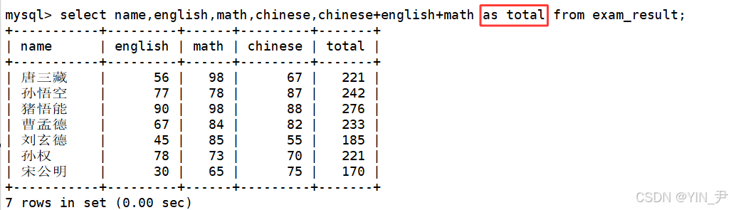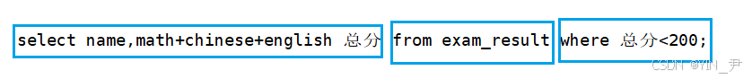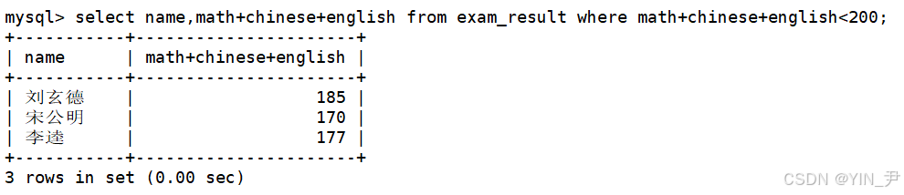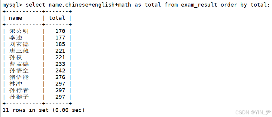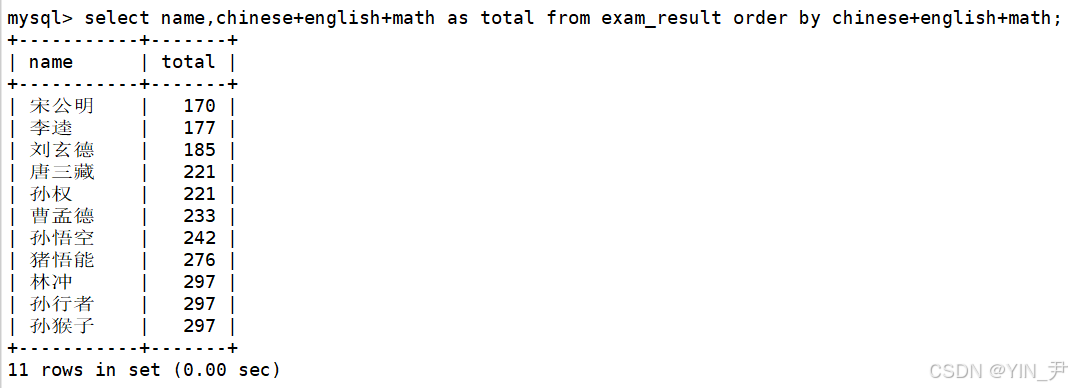 select name,chinese+english+math as total from exam_result order by chinese+english+math;(默认升序)