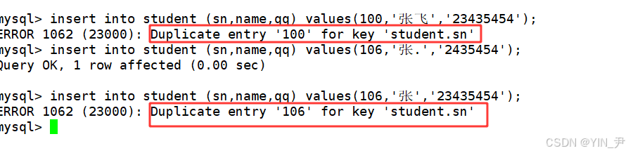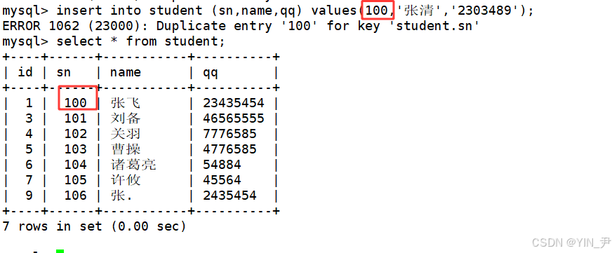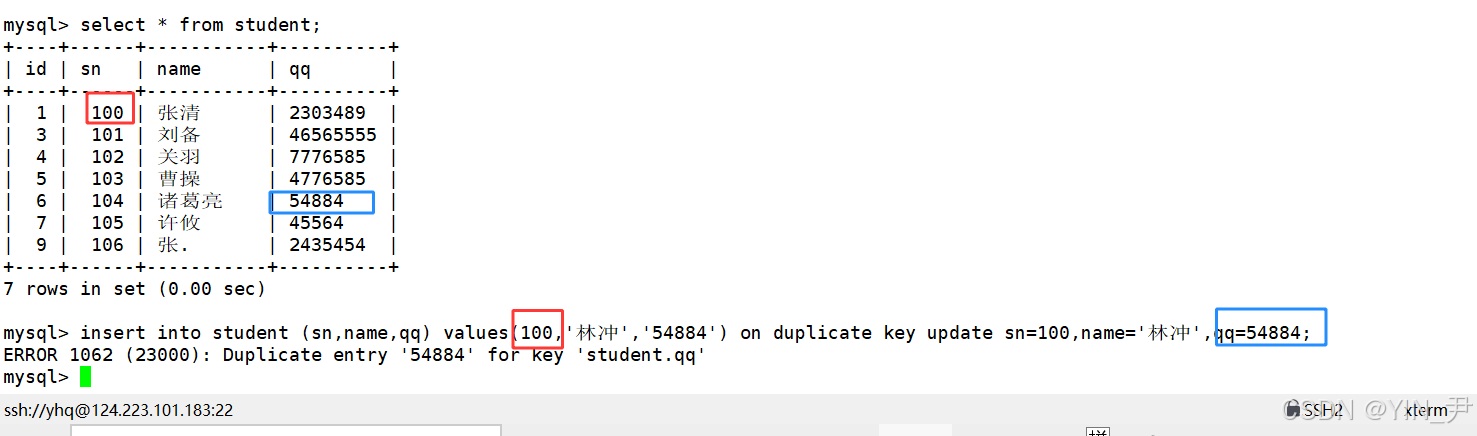 首先插入的时候,sn发生了冲突(100),所以执行后面的更新操作,但是QQ要更新的值又与许攸这行数据的QQ这一列发生了键值冲突。