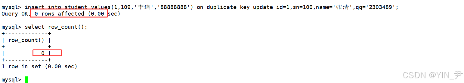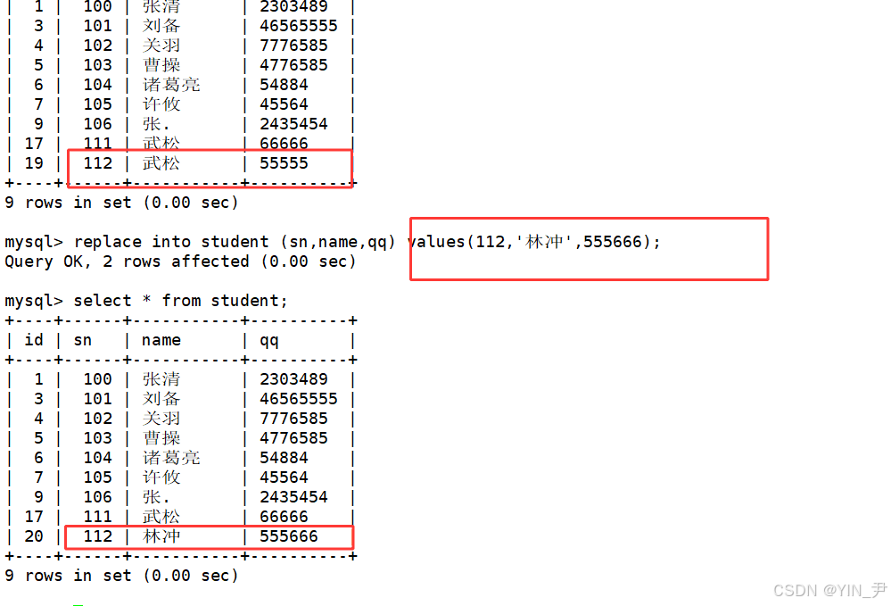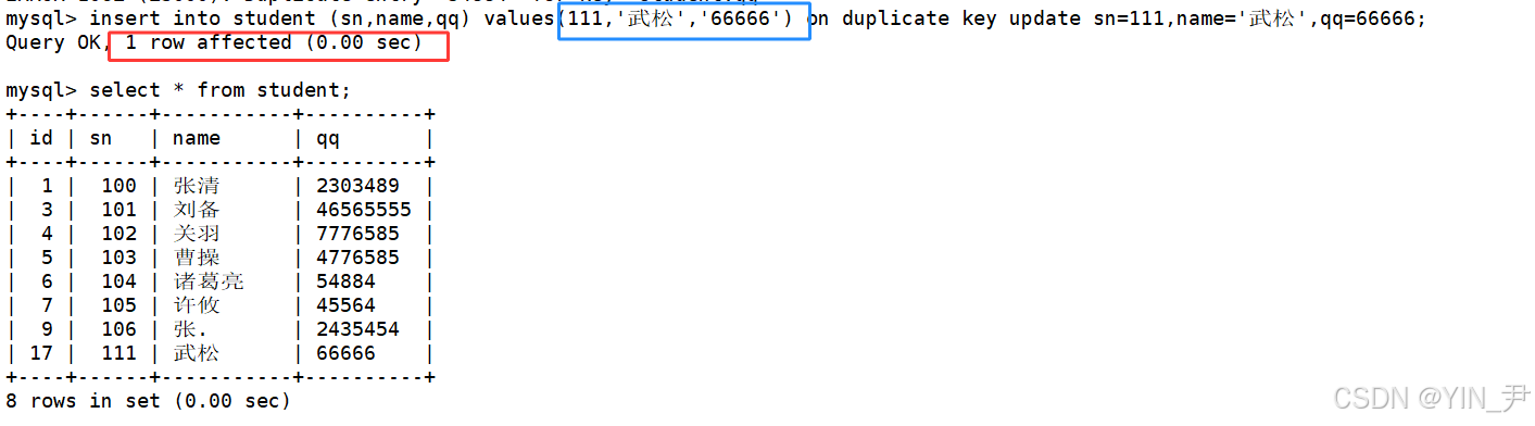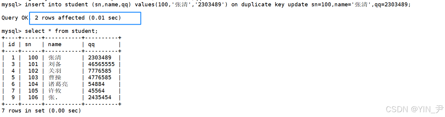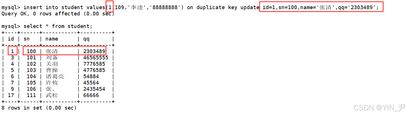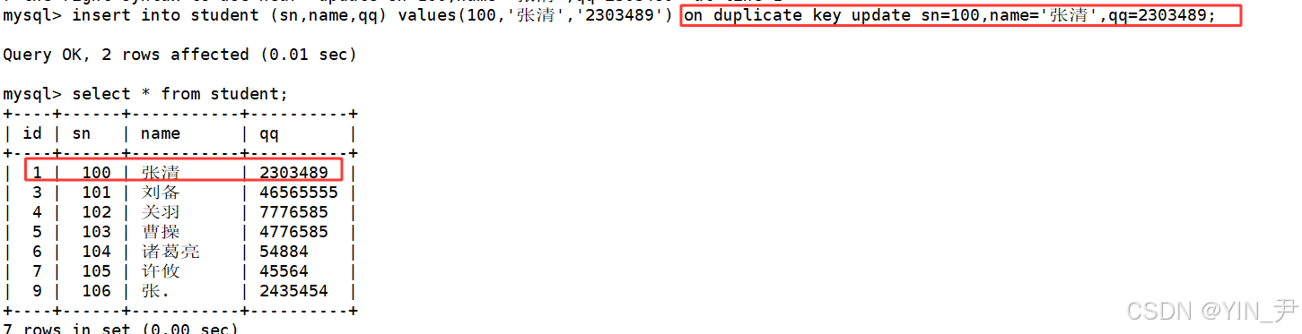 insert into student (sn,name,qq) values(100,'张清','2303489') on duplicate key update sn=100,name='张清',qq=2303489;