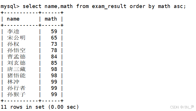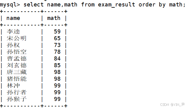 select name,math from exam_result order by math asc;