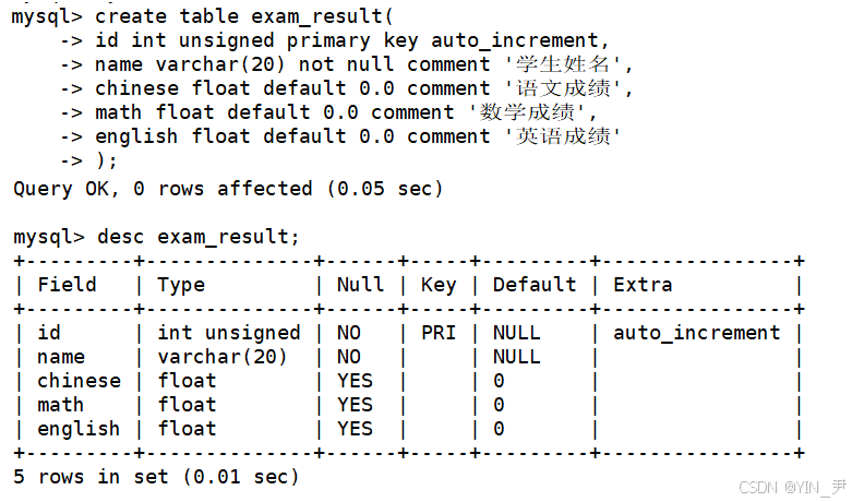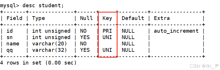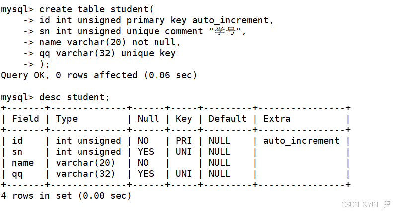 create table student( id int unsigned primary key auto_increment, sn int unsigned unique comment "学号", name varchar(20) not null, qq varchar(32) unique key );