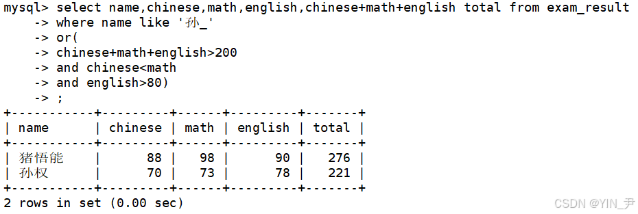 select name,chinese,math,english,chinese+math+english total from exam_result where name like '孙_' or( chinese+math+english>200 and chinese<math and english>80);