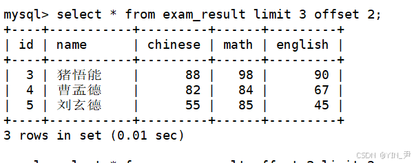 select * from exam_result limit 3 offset 2;