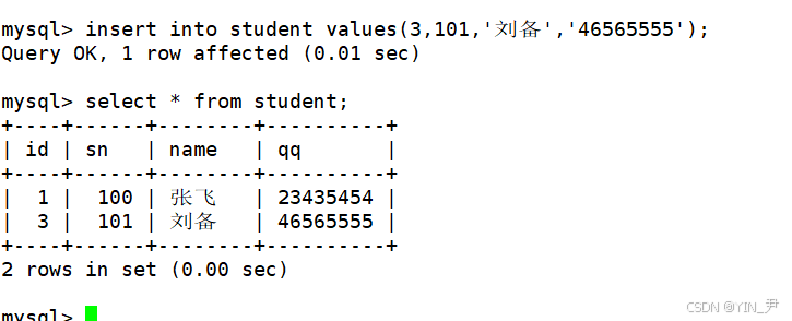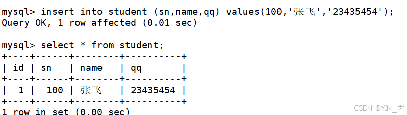 insert into student (sn,name,qq) values(100,'张飞','23435454');