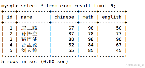 select * from exam_result limit 5;