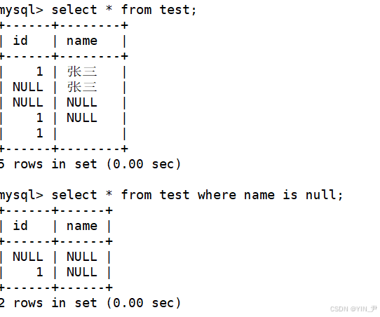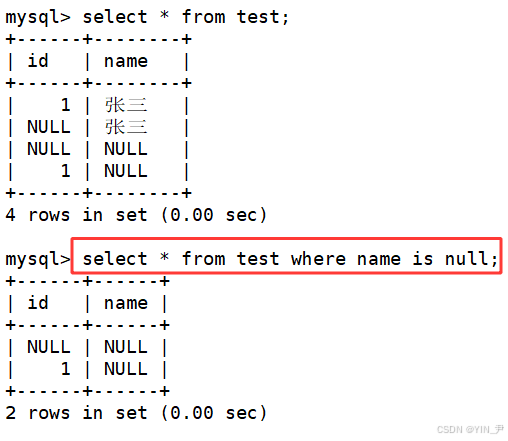 select * from test where name is null;