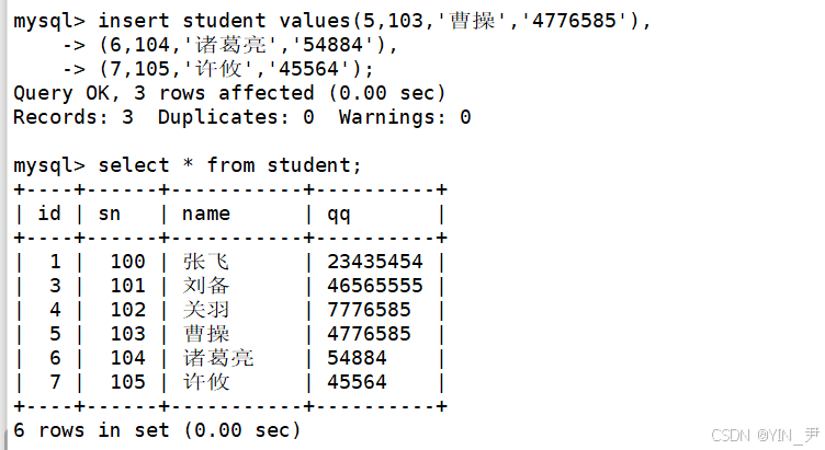 insert student values(5,103,'曹操','4776585'), (6,104,'诸葛亮','54884'), (7,105,'许攸','45564');