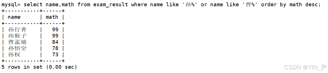 select name,math from exam_result where name like '孙%' or name like '曹%' order by math desc;
