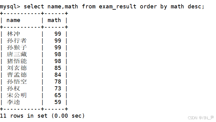 select name,math from exam_result order by math desc;