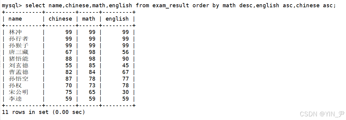select name,chinese,math,english from exam_result order by math desc,english asc,chinese asc;