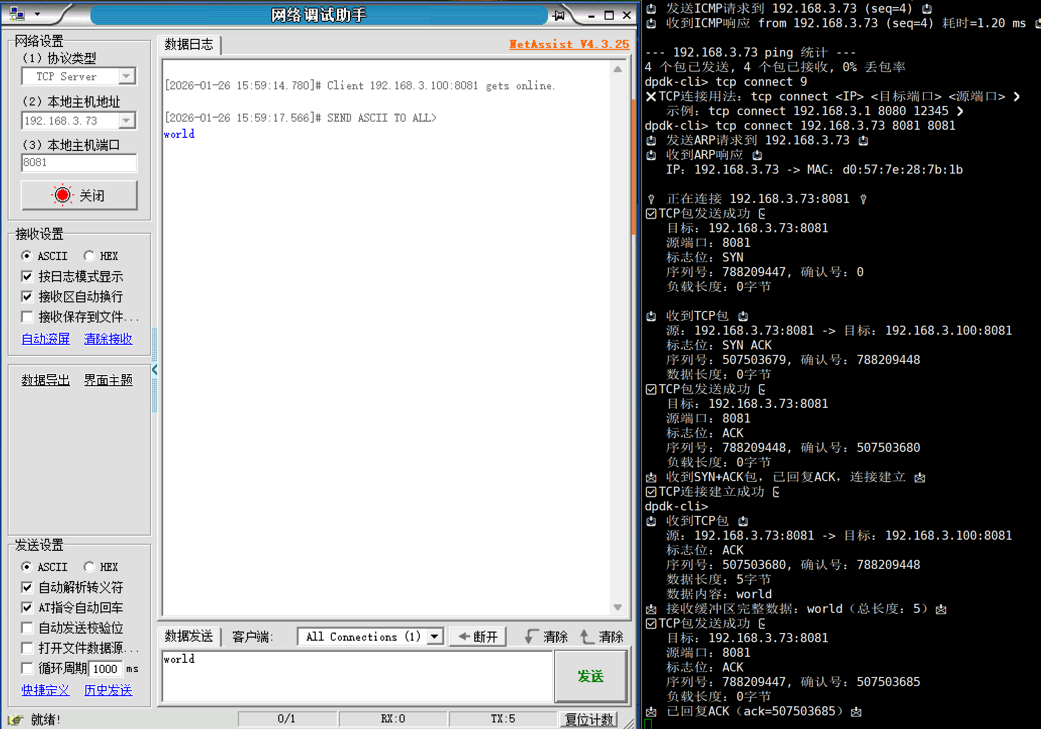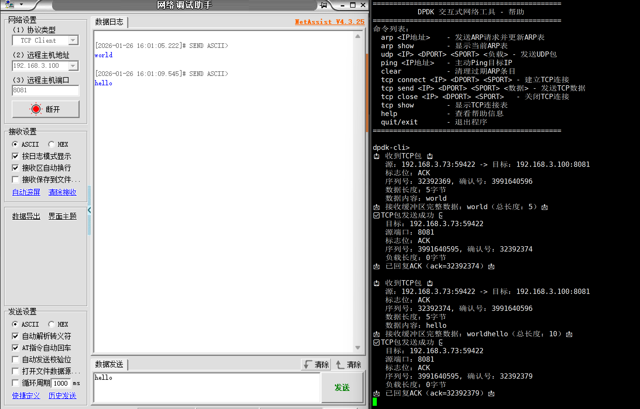 │ │ ├─ 粘包处理:接收缓冲区累积数据,打印完整缓存内容
