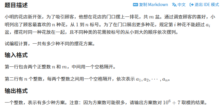 - 第三层for(k)循环:遍历这个种类所拥有的个数,但是k要满足条件(k <= a[i] && k <= j),否则是不符合标准的;因为方案数可能很大,在每次计算时,我们要边求和,边取模,就可以保证最终的结果准确