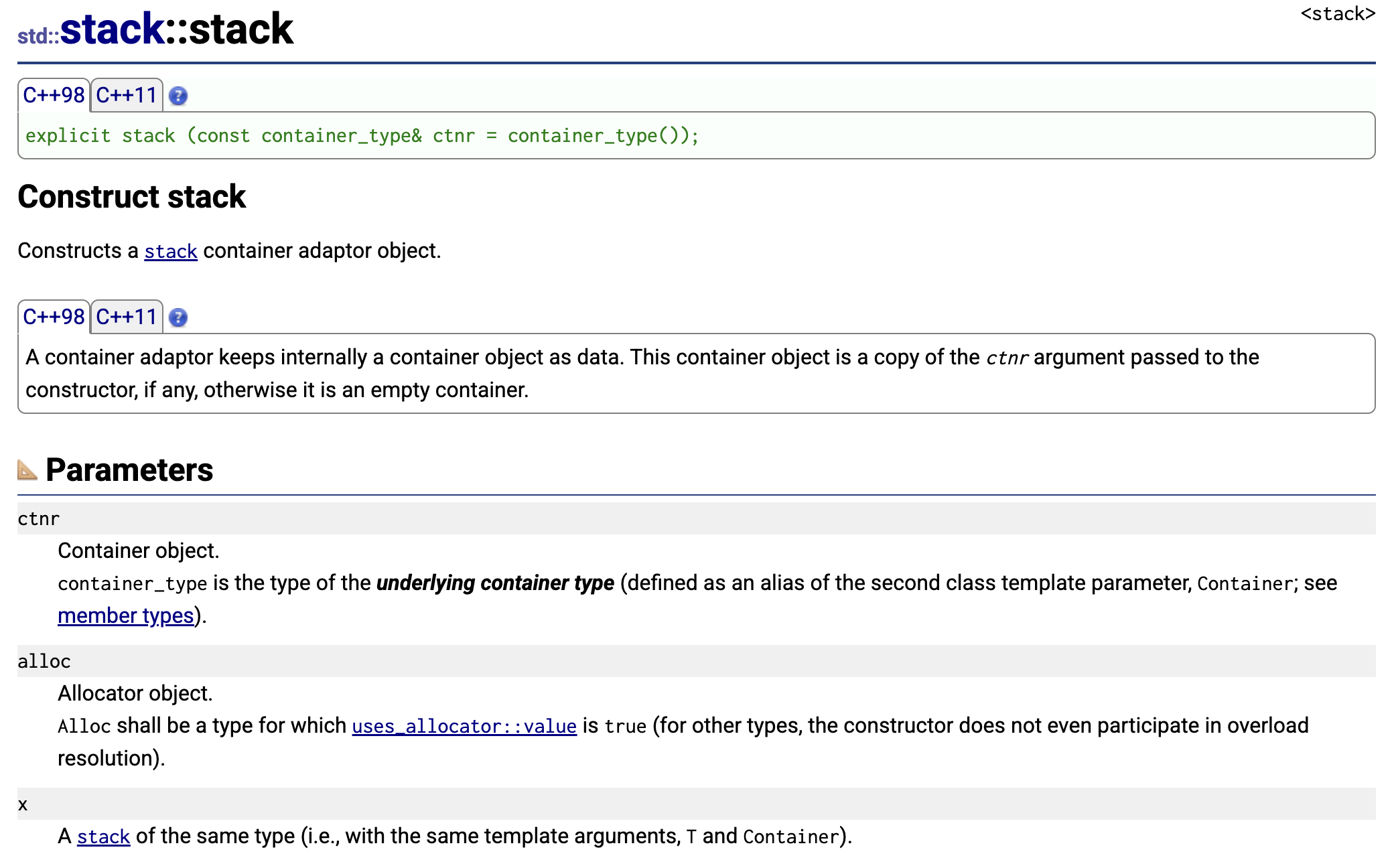 这是C++ 标准库中std::stack构造函数的官方文档说明.