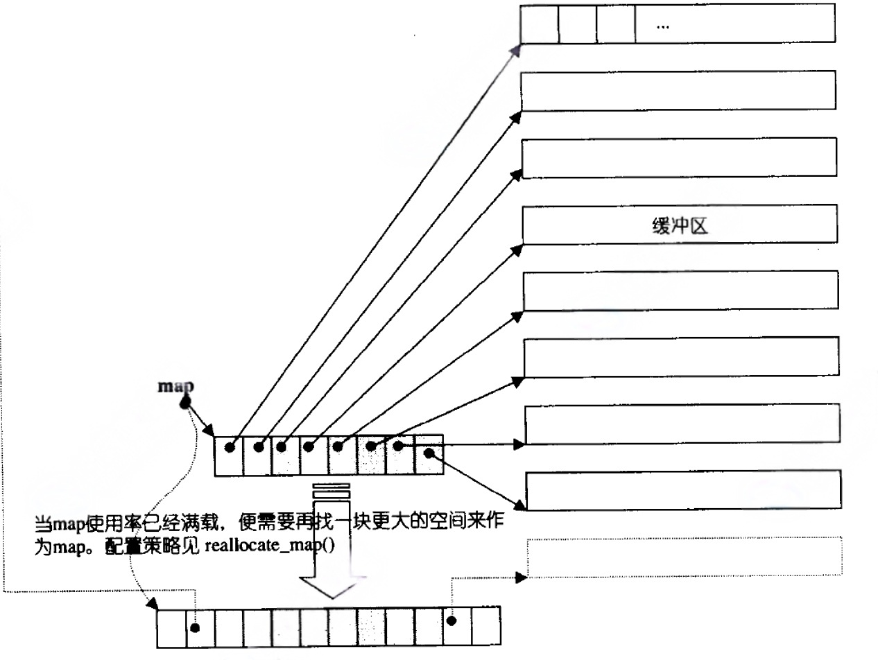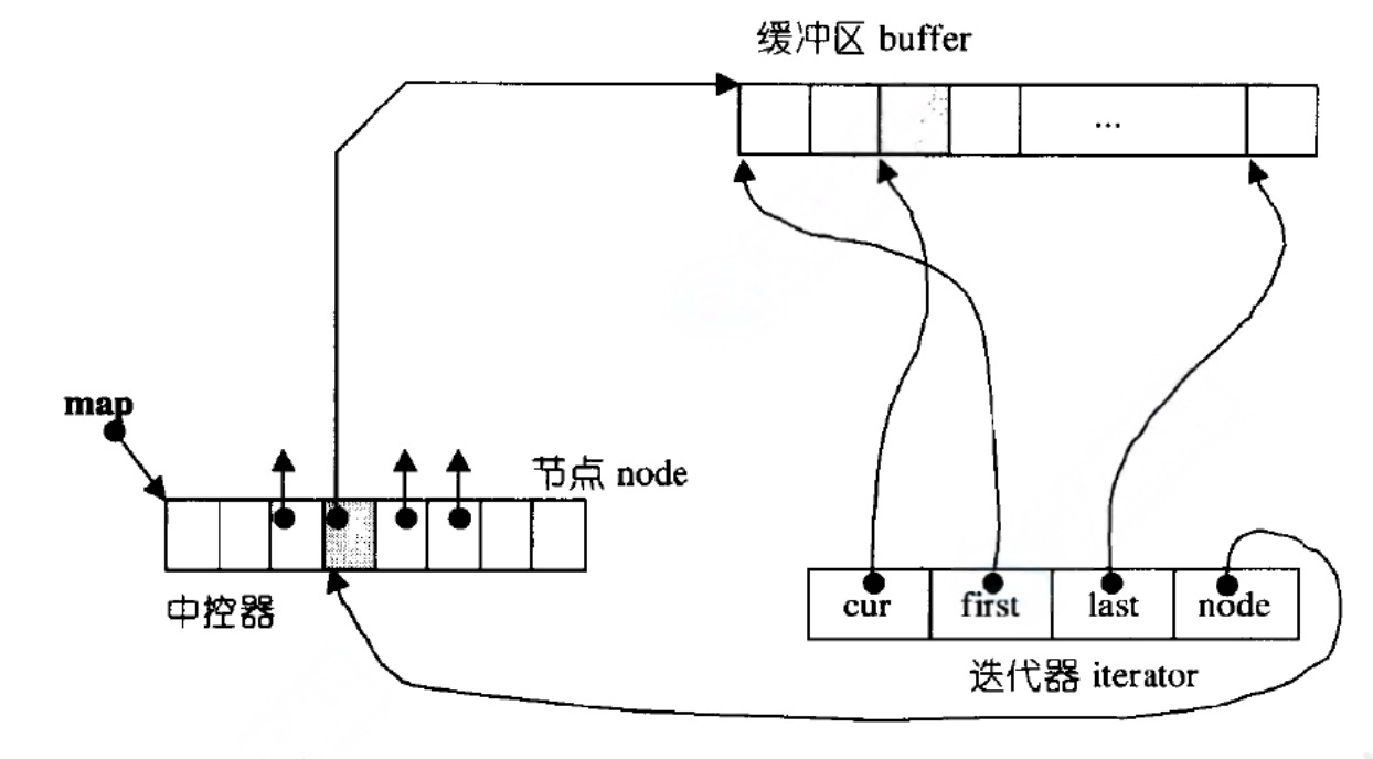 双端队列底层是一段假象的连续空间,实际是分段连续的,为了维护其"整体连续"以及随机访问的假象,落在了deque的迭代器身上,因此deque的迭代器设计就比较复杂,如下图所示: