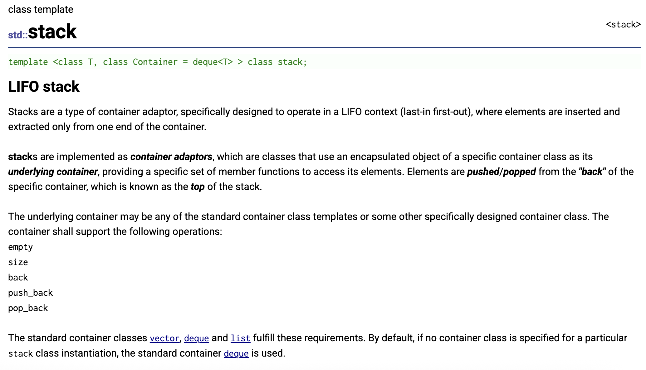 这是C++ 标准库中std::stack的官方文档说明.stack 是C++ STL(标准模板库)中的容器适配器(不是独立容器),它封装了底层容器(默认是 deque),并强制遵循后进先出(LIFO, Last In First Out)的访问规则 ------ 只能从栈顶插入、删除和读取元素,无法随机访问栈中的其他元素,也不支持迭代器遍历.