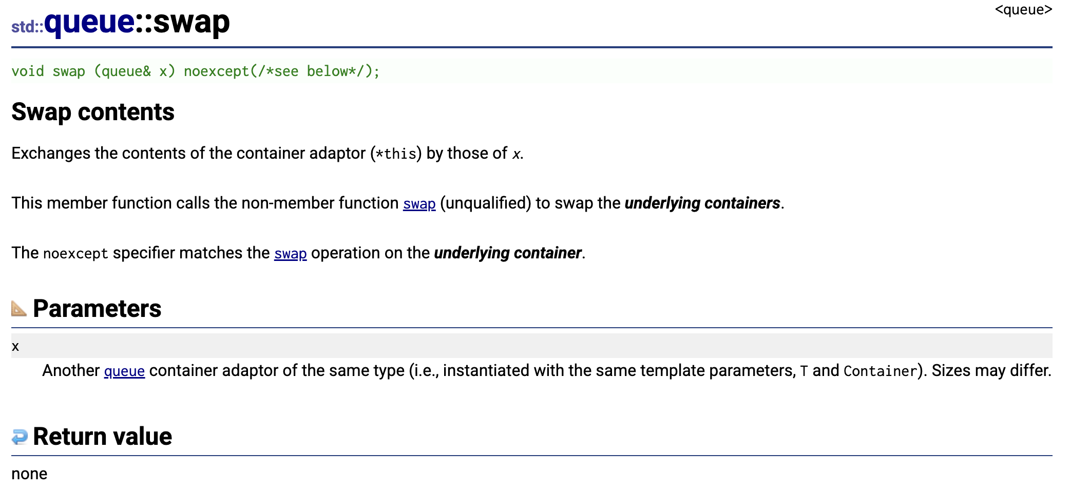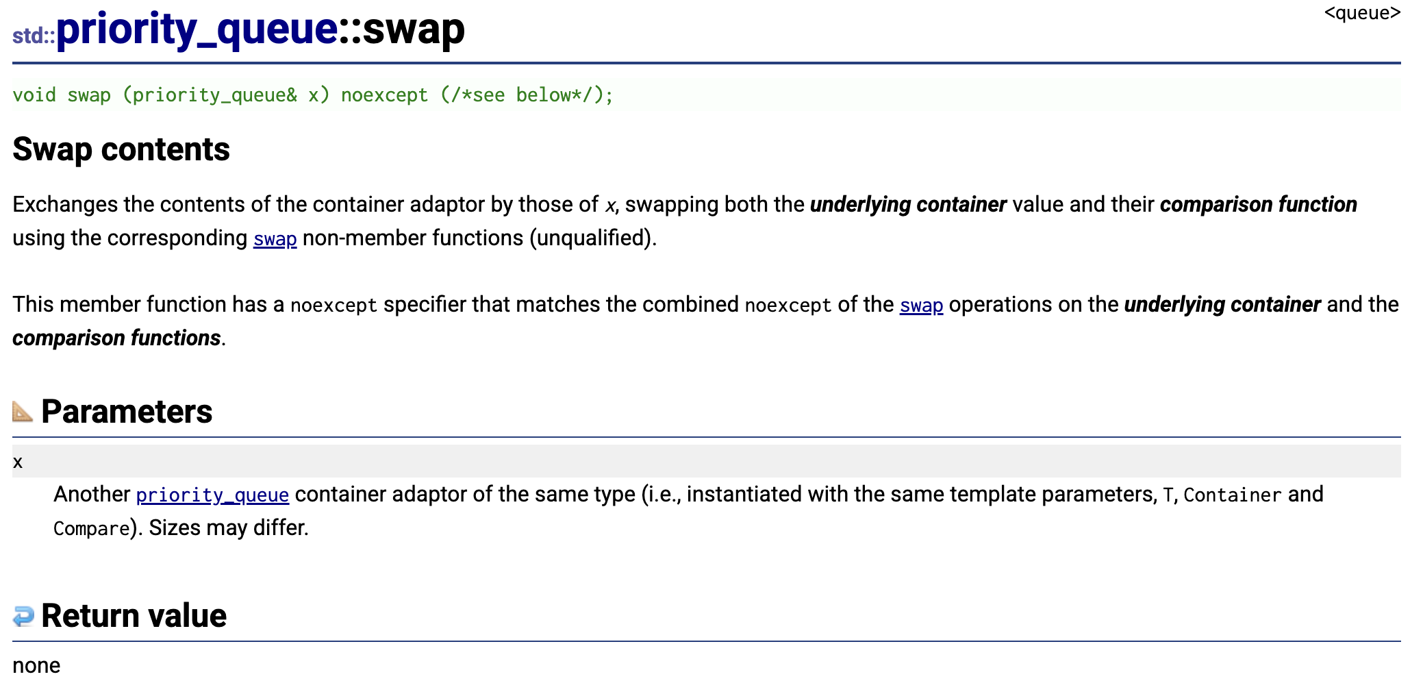 void swap(PriorityQueue<T, Container, Compare>& pq1, PriorityQueue<T, Container, Compare>& pq2) noexcept {