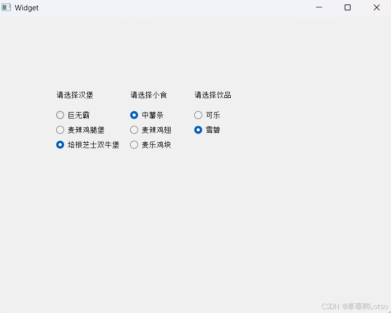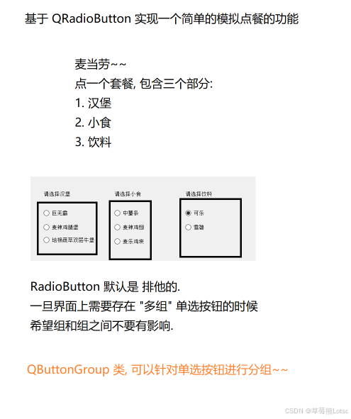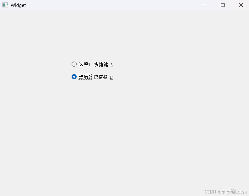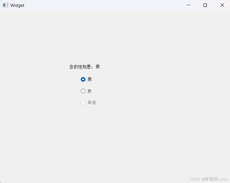QRadioButton适用于 "多选一" 场景(如性别选择、选项切换),默认具备互斥性(排他性) (选中一个会取消其他),可通过QButtonGroup分组实现多组单选。