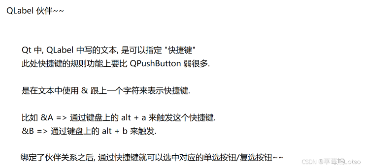 setText(const QString& text):设置显示文本;setPixmap(const QPixmap& pixmap):设置显示图片;setAlignment(Qt::Alignment alignment):设置文本 / 图片对齐方式;setScaledContents(bool flag):开启图片自适应 Label 尺寸;setBuddy(QWidget* buddy):关联伙伴控件(点击 Label 激活伙伴)。