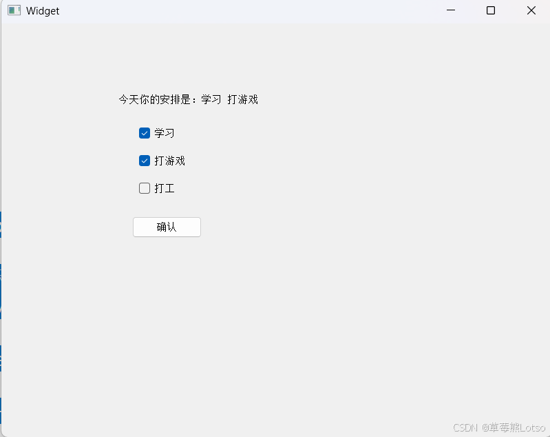 - 拖放 3 个 CheckBox(学习 / 打游戏 / 打工)和 1 个确认按钮;