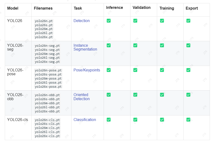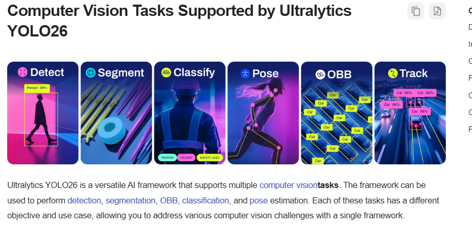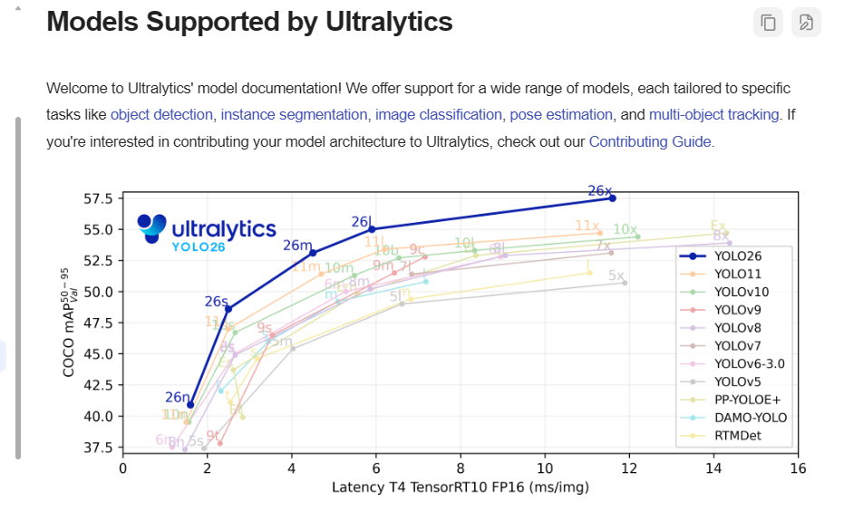 既然想做这个,用什么模型呢?Yolo 模型在图像识别领域使用起来还是挺方便的,之前工作中就接触过 yolo 5 模型,去官网一看,现在都已经到 yolo 26 了,本着学新不学旧的原则,而且看起来 yolo 26 相比较于之前的模型,在识别准确率方便有着明显的优势,而且在边缘计算方便做了很大的优化,很适合在手机端部署。