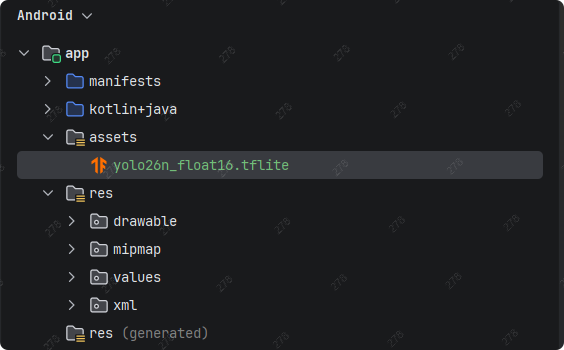 将生成好的 tflite 模型放在 assets 目录下,如下图所示:
