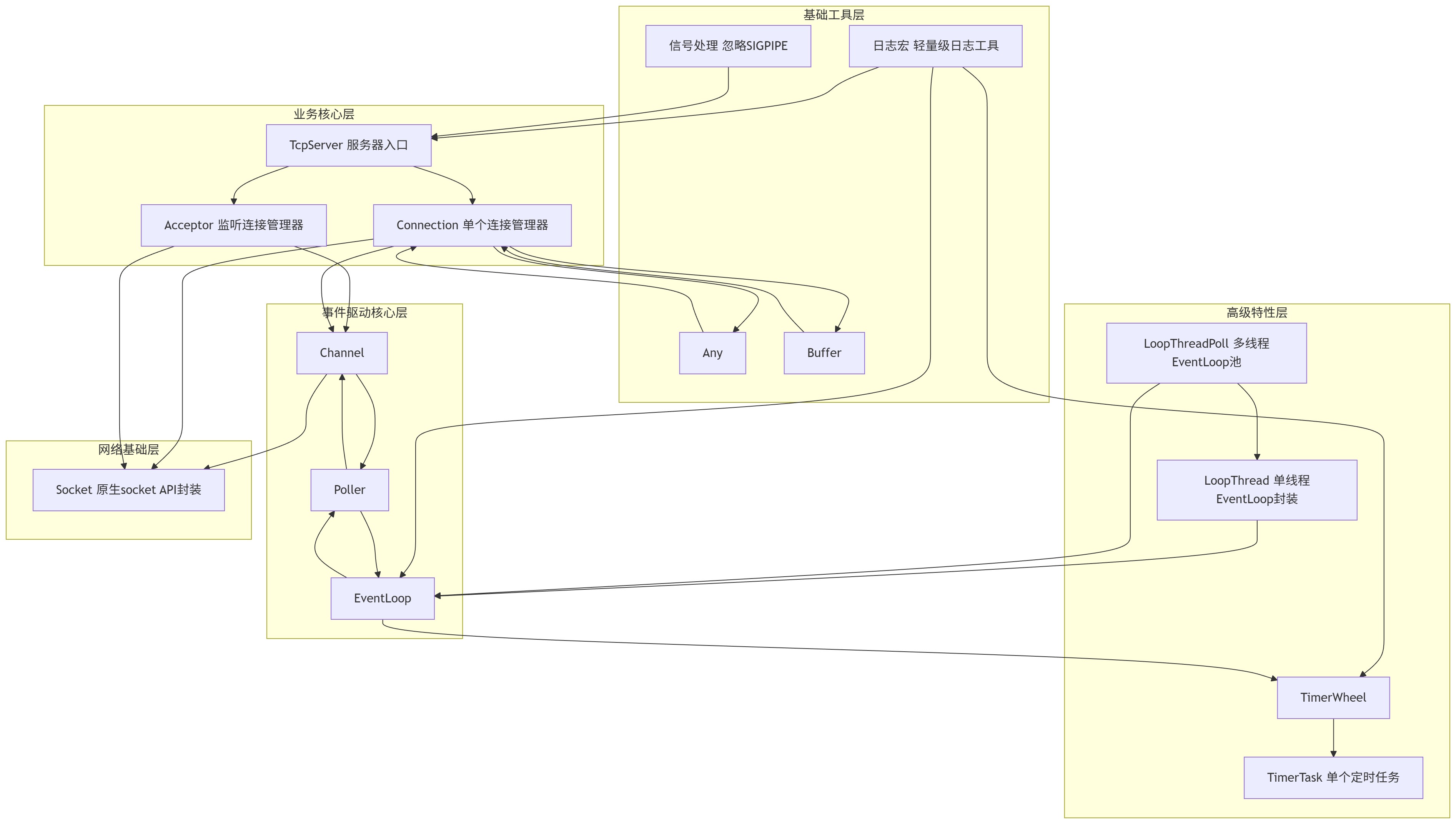 项目遵循高内聚,低耦合的原则,将整体架构拆解为「基础工具层、网络基础层、事件驱动核心层、高级特性层、业务核心层」五大层级,各层级自上而下依赖、自下而上支撑,形成完整的TCP服务器闭环。具体图示如下:
