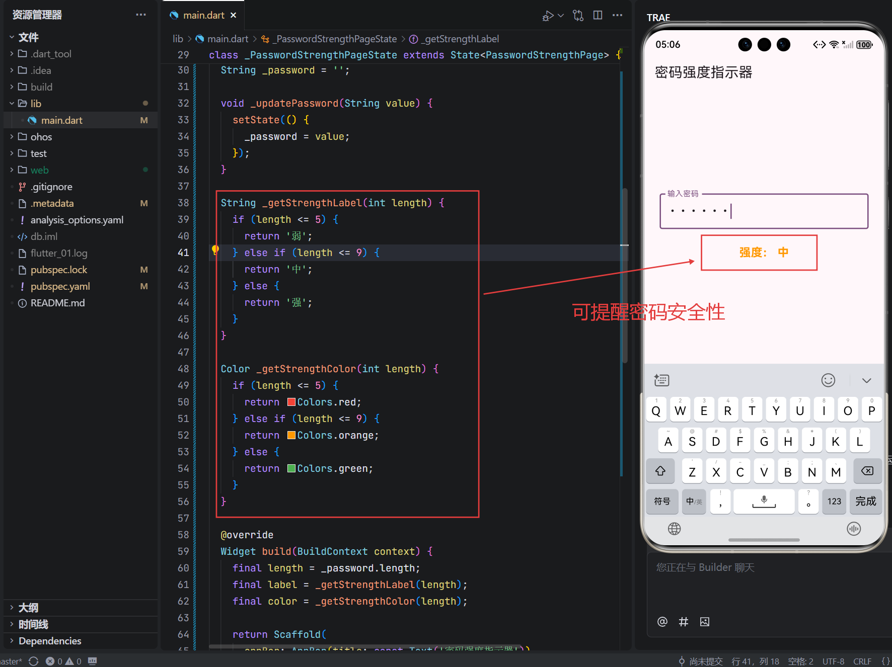 但专业密码强度检测需分析字符类型(大小写、数字、符号),涉及正则和复杂逻辑。而本文采用最简可行方案:仅基于长度分级 ,虽不完美,但足够用于演示、教育或低安全场景(如本地笔记加密)。