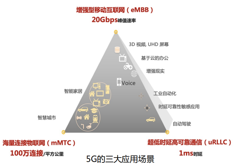 - (3)海量终端互联(mMTC):侧重于人与物之间的信息交互,主要场景包括车联网、智能物流、智能资产管理等,要求提供多连接的承载通道,实现万物互联。