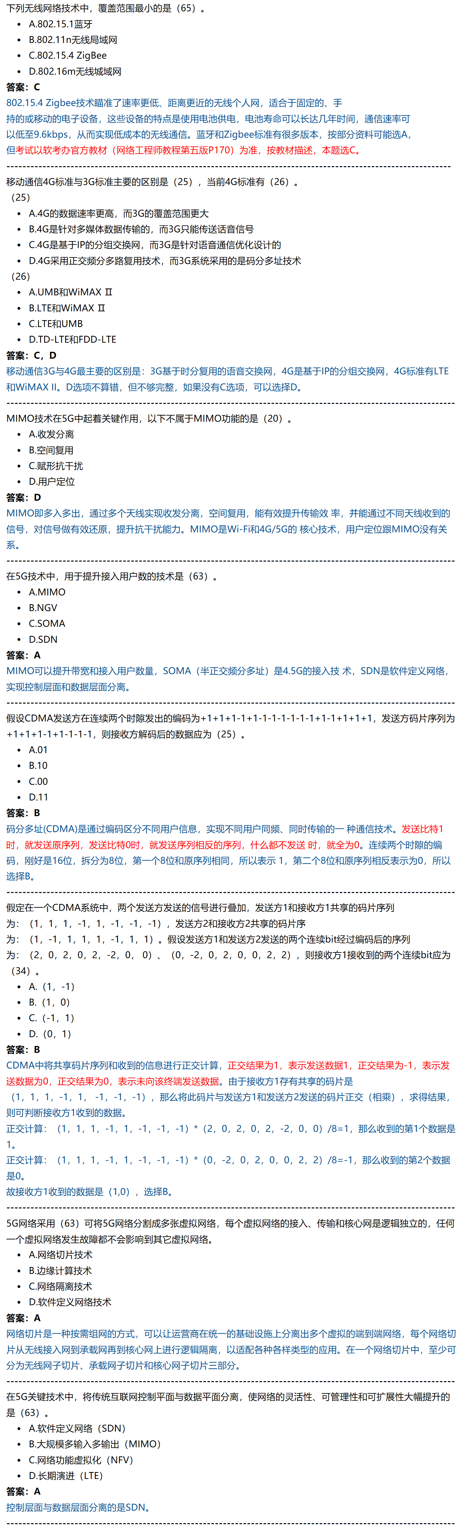 - 码分多址(CDMA)是通过编码区分不同用户信息,实现不同用户同频、同时传输的一种通信技术。