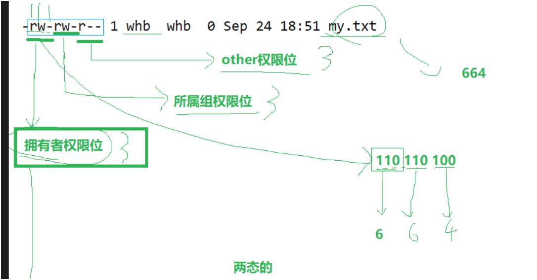 | 修改对象 | 所有者(用户名 / UID) | 所属组(组名 / GID) | 权限位(r/w/x),分三类身份:① 所有者(u)② 所属组(g)③ 其他人(o) |
