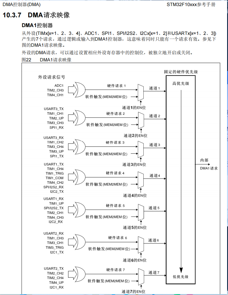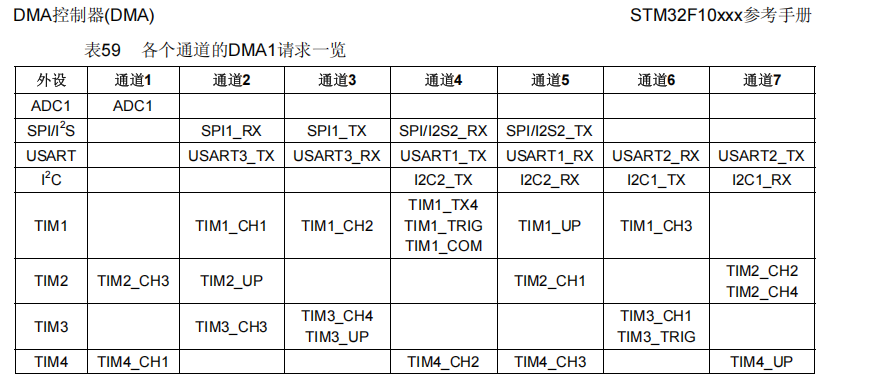 | 结论: 1、DMA就是建立数据传输通道 2、DMA1有7个通道,DMA2有5个通道 |
