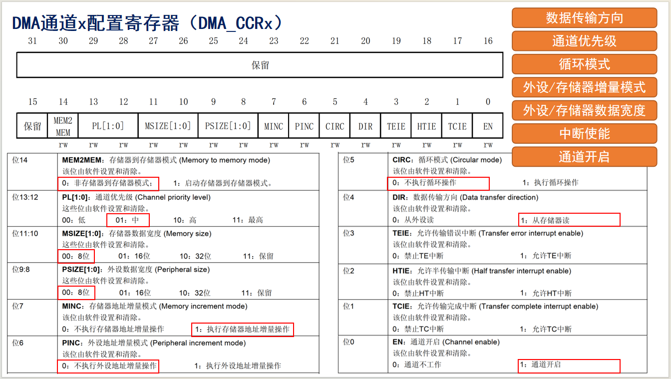 | HAL_DMA_Start_IT (...) | DMA_CCR/CPAR/CMAR/CNDTR | 开始DMA传输 |