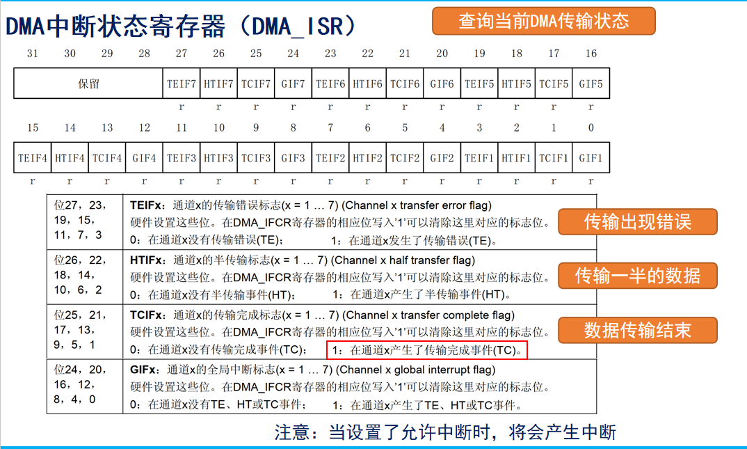 | __HAL_DMA_GET_FLAG(...) | DMA_ISR | 查询DMA传输通道的状态 |